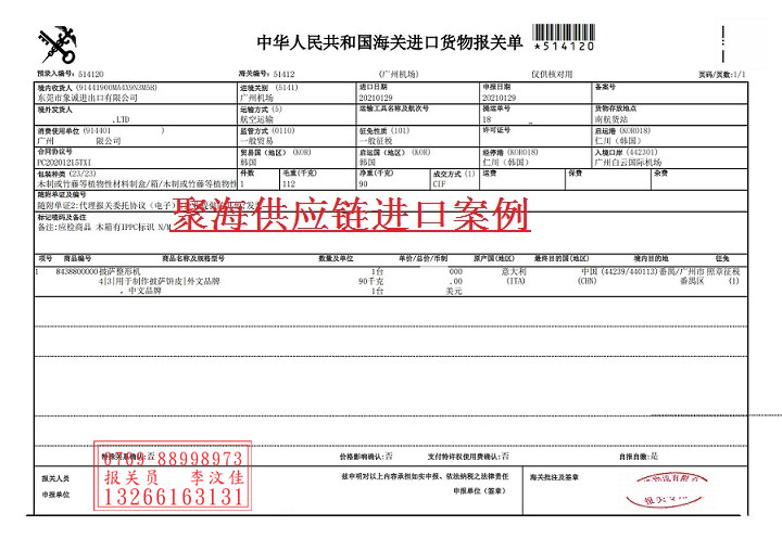 西式面點(diǎn)因其獨(dú)特的異域風(fēng)味越來(lái)越受?chē)?guó)人的喜愛(ài),特別是披薩餅深受現(xiàn)代年青人和小朋友的追捧.如果想要開(kāi)一家披薩餐廳,除了需要有懂技術(shù)的師傅,還有可能需要國(guó)外采購(gòu)專(zhuān)門(mén)制作披薩餅的設(shè)備.那么你可知道食品機(jī)械進(jìn)口時(shí),需要辦理什么手續(xù)?進(jìn)口海關(guān)稅費(fèi)有多高?如果安排空運(yùn)進(jìn)口,那么是什么樣的進(jìn)口流程?等,聚海供應(yīng)鏈小編剛剛替客人從韓國(guó)進(jìn)口了一臺(tái)披薩整形機(jī),現(xiàn)將廣州機(jī)場(chǎng)進(jìn)口清關(guān)手續(xù)以及進(jìn)口操作流程分享給大家:
