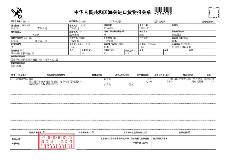 銀漿進(jìn)口報(bào)關(guān)單案例