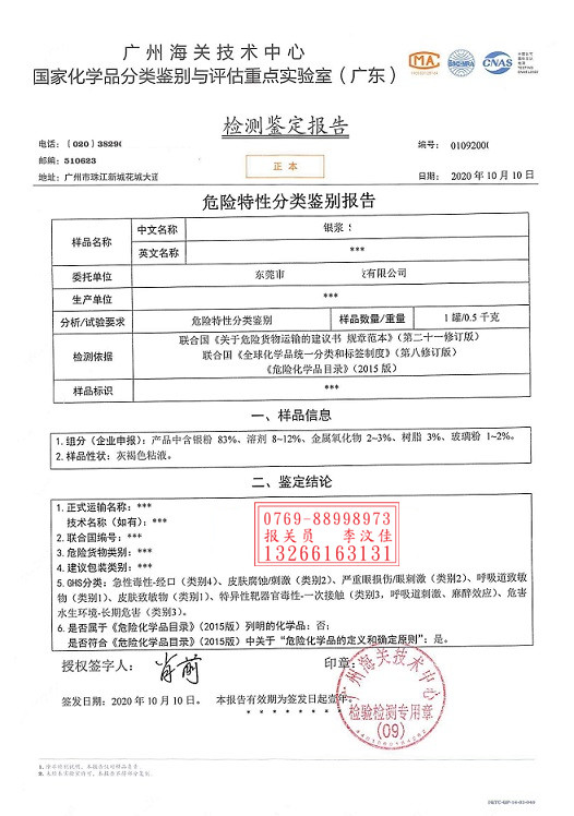 其二,因?yàn)殂y漿根據(jù)市場(chǎng)需要,也可以分很多種,而銀漿原本成分大多都是帶有危險(xiǎn)性的,如果某種成分構(gòu)成比例偏大,那么很有可能就會(huì)被定義為危險(xiǎn)品;當(dāng)然這一結(jié)果的判定的建立在成分檢測(cè)結(jié)果的基礎(chǔ)之上的.
