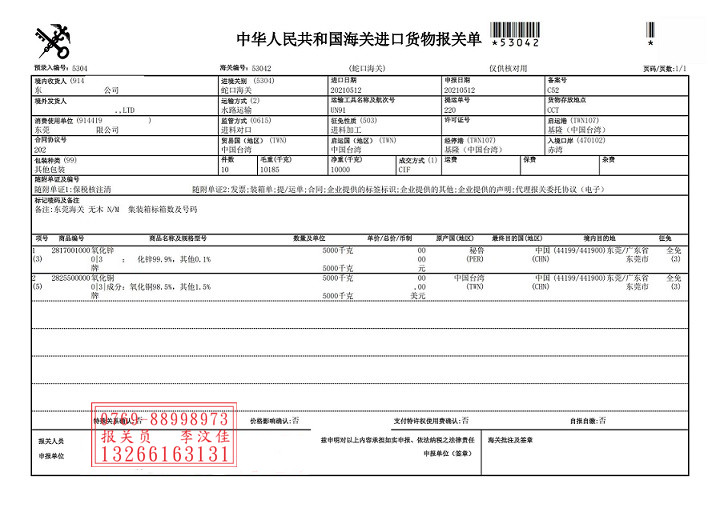 進(jìn)口臺(tái)灣氧化銅蛇口港報(bào)關(guān)案例