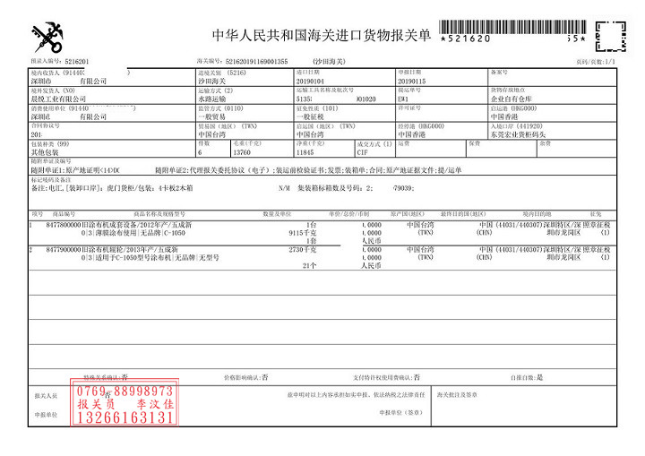 三,舊涂布機成套設備進口清關文件: