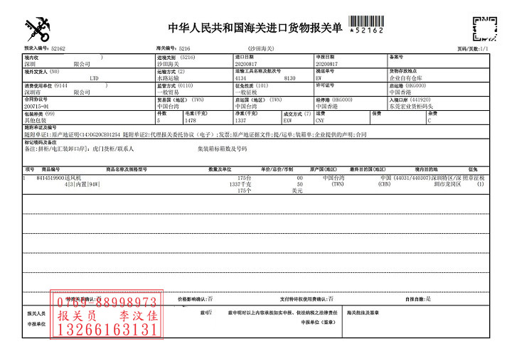 四,臺灣送風(fēng)機(jī)進(jìn)口報(bào)關(guān)流程: